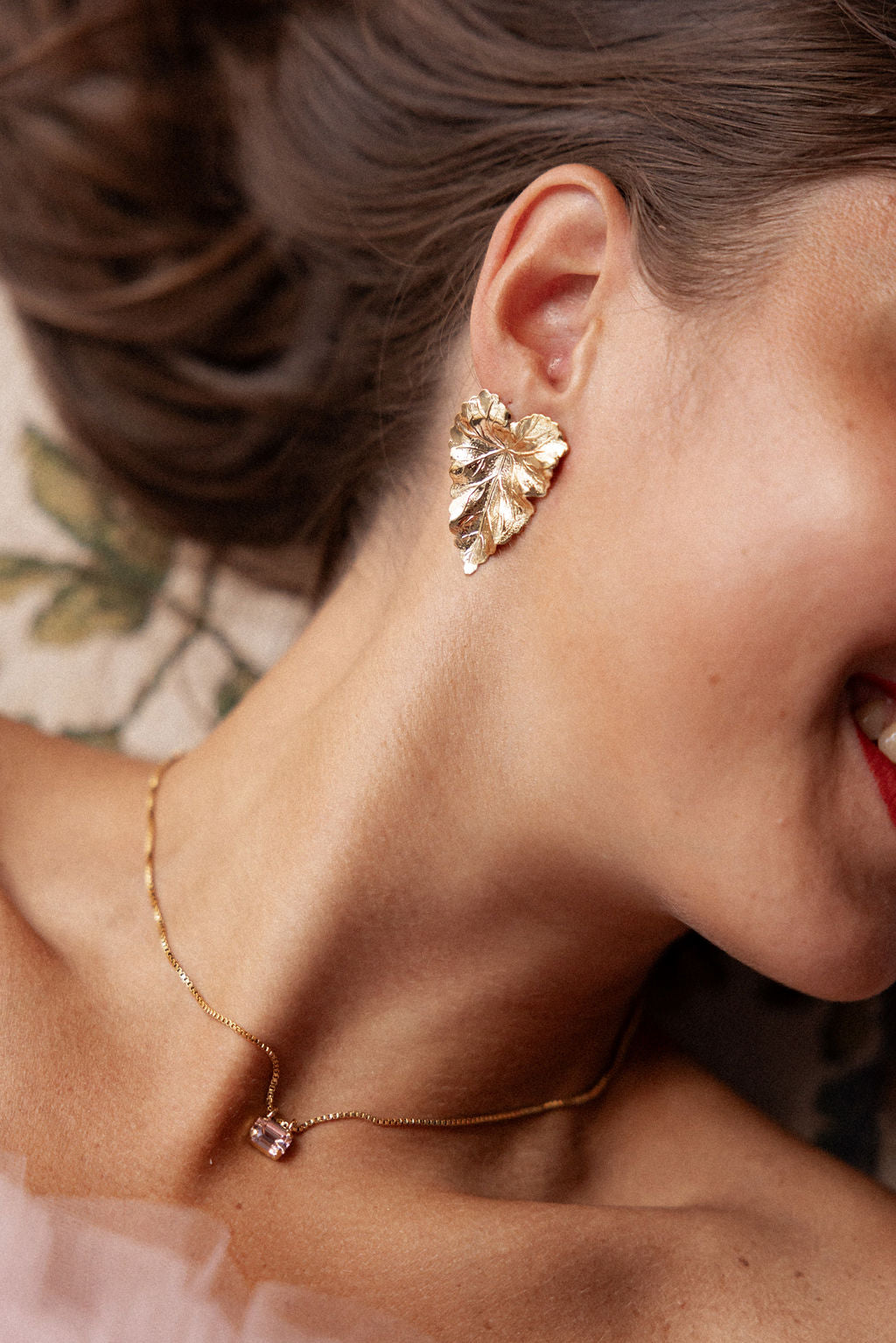 Ces boucles d’oreilles délicatement façonnées en forme de feuilles d’arbre capturent toute la grâce et la légèreté de la nature. Elles existent en deux tailles pour des looks affirmés ou plus discrets.